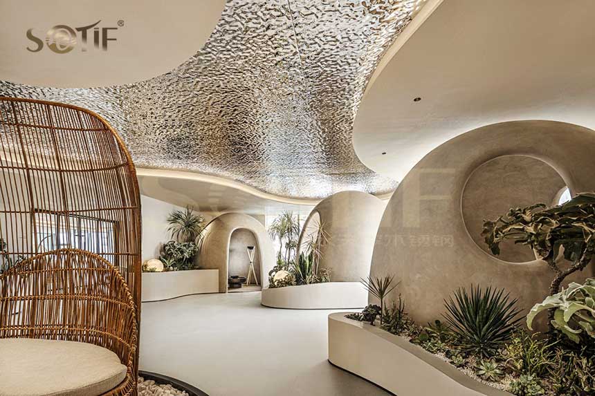 不銹鋼水波紋吊頂裝飾采用不銹鋼水波紋板或不銹鋼蜂窩板制成,具有輕質(zhì)高強(qiáng)、防腐、防火等優(yōu)點(diǎn),可以為公共場(chǎng)所提供更多的選擇。不銹鋼水波紋吊頂裝飾在公共場(chǎng)所中的應(yīng)用主要體現(xiàn)在以下幾個(gè)方面: