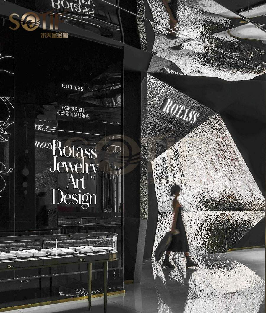 不銹鋼水波紋板裝飾在頂面上的天花板上,使整個空間透明在不同光線或光照下深度變化閃閃發(fā)光,大大加深了空間層次感。