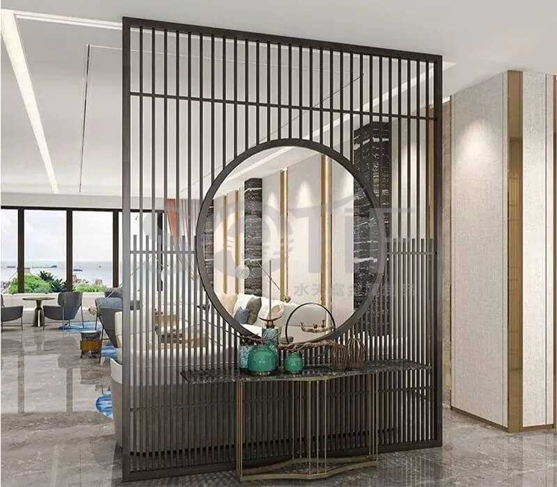 不銹鋼屏風在金面表面噴涂色油,然后經過拉絲處理,使其表面形成一種古銅色的金屬工藝處理方法。使不銹鋼屏風看起來有一種歷史滄桑之感。