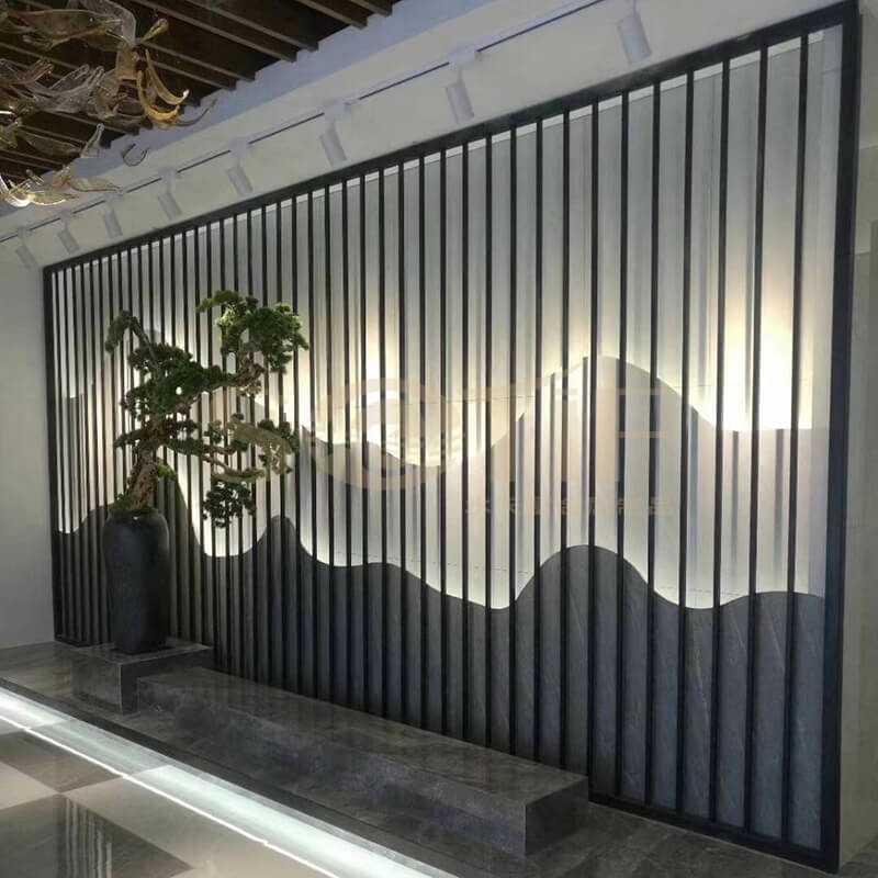 激光鏤空切割屏風,通過大型激光切割機切割鏤空得出一定圖案,再經過表面處理后,真空電鍍著色。