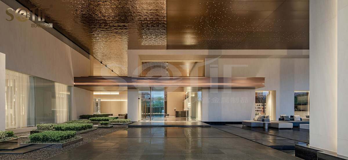 很大程度上可以用不銹鋼裝飾板進行裝飾,而黃色鈦金往往蘊含著財富的含義,更適合大堂的裝飾應用;