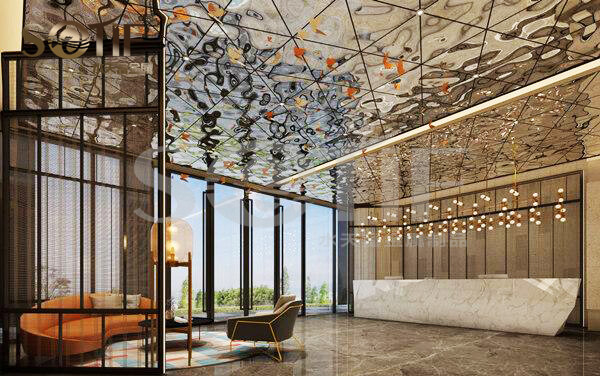 鏡面不銹鋼水波紋板運用于頂面天花,使整個空間變得透明,不同光線或燈光下的深度變化波光粼粼,極大加深了空間美感,又有多種顏色可以選擇,顏色穩定不褪色,外觀上表面光潔,材質高檔,并在景觀、商場、酒店、會所、售樓部等場所被廣泛使用。