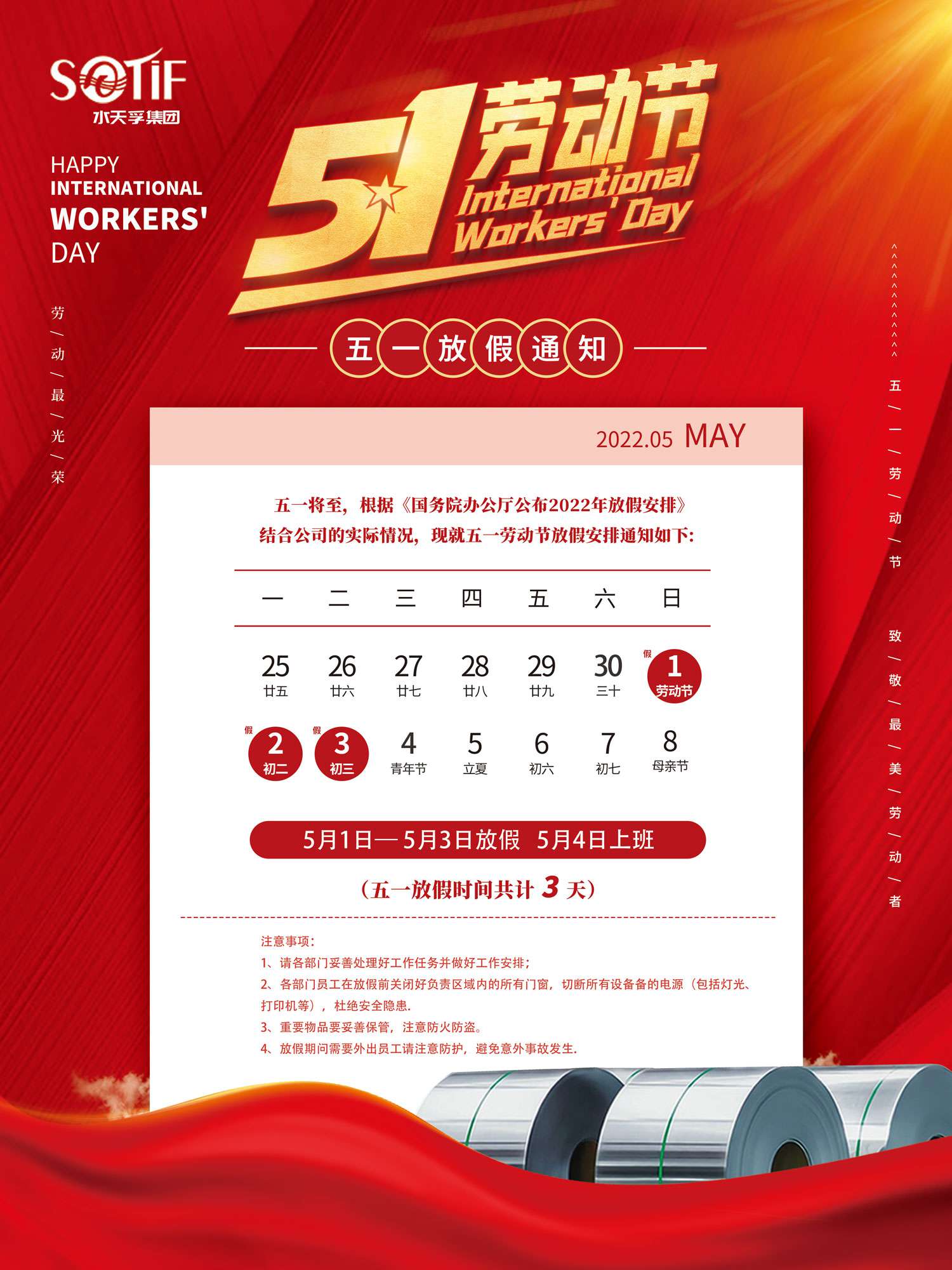 水天孚集團2022年勞動節放假通知安排如下:5月1號至5月3號放假休息,共三天。5月4號(星期三)正常上班。