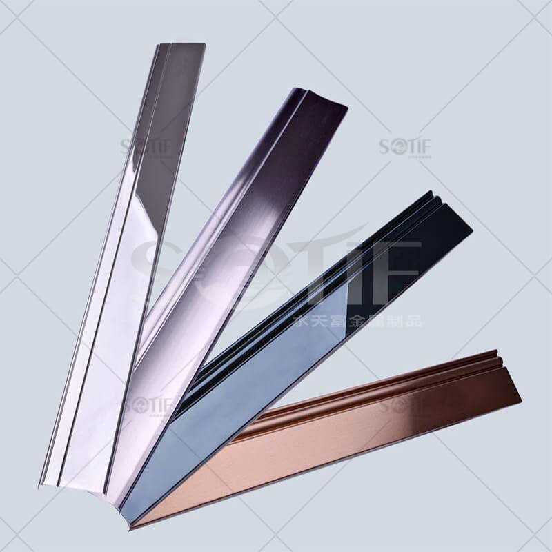 不銹鋼裝飾條慣例201,304型號,銀色,玫瑰金,香檳金,黑鋼、鈦金、古銅顏色等。不銹鋼裝飾線條的裝飾優點還有就是比擬的百搭,顏色的選擇也比擬的豐厚,作風效果比擬的小氣,共同的金屬質感給我們的房子加分不少。故而越來越多人選擇用不銹鋼裝飾條。