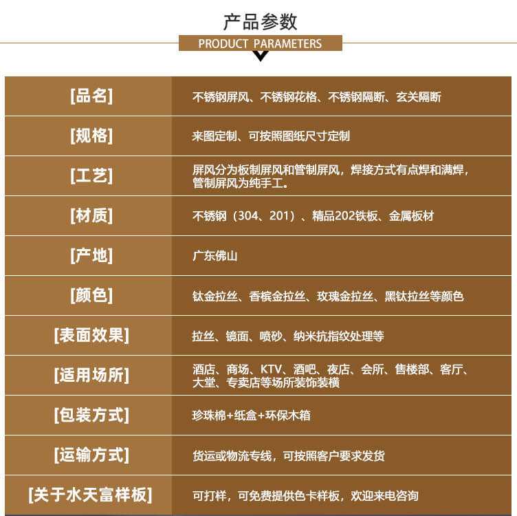 產(chǎn)品系列:屏風(fēng)隔斷產(chǎn)品型材:201、202、301、304、316、309、321等生產(chǎn)品牌:水天富不銹鋼合作方式:來圖定制